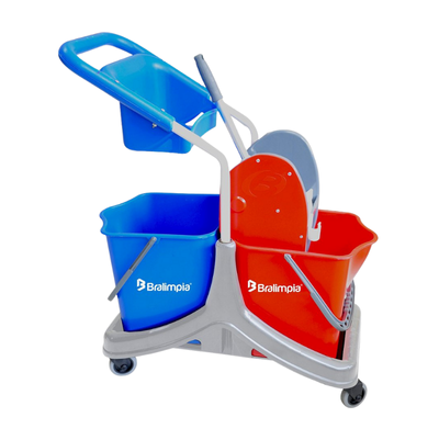 Conjunto de dois baldes com capacidade para 25L cada, com cavalete e espremedor para limpeza de pisos frios em geral.